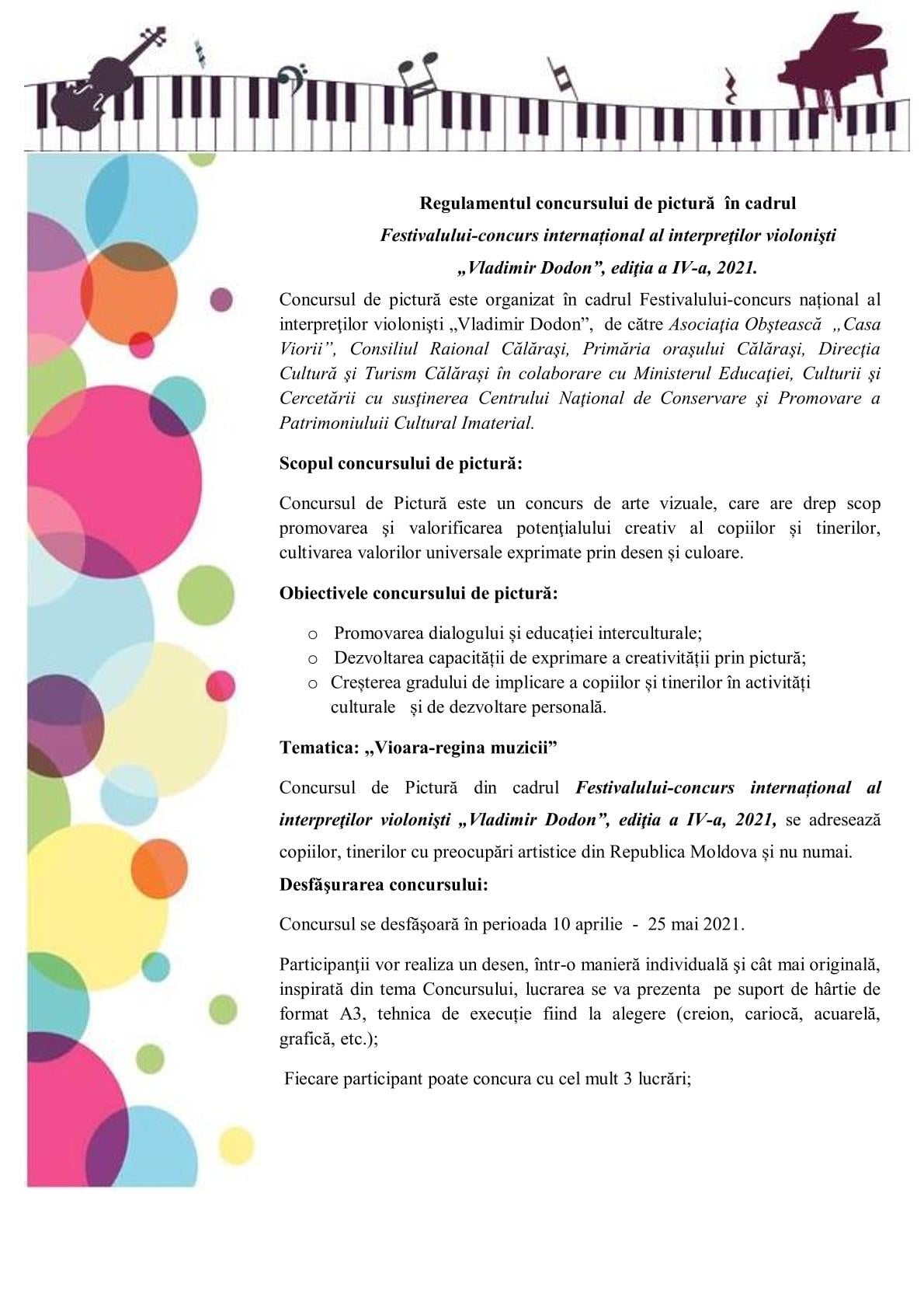 Asociația Obștească ”Casa Viori” din Călărași, în parteneriat cu Consiliul raional Călărași, Primăria oraşului Călăraşi, Direcţia Cultură şi Turism Călărași în colaborare cu Ministerul Educaţiei, Culturii şi Cercetării cu susţinerea Centrului Naţional de Conservare şi Promovare a Patrimoniuluii Cultural Imaterial a lansat un concurs de pictură cu tematica ,,Vioara – regina muzicii”. Acesta este organizat în cadrul Festivalului – concurs național al interpreţilor violonişti „Vladimir Dodon”, ediţia a IV-a .