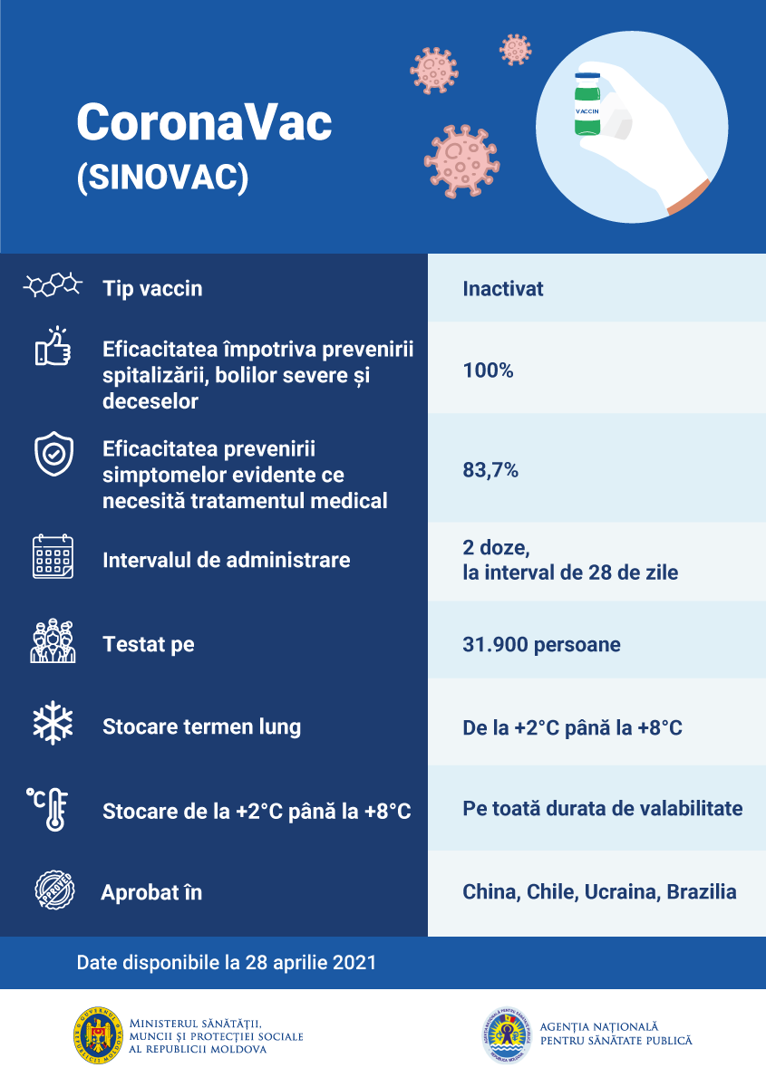 CoronaVac e un vaccin dezvoltat de compania farmaceutică Sinovac Biotech din China. Acesta se administrează în două etape la o distanță de 28 de zile. Vaccinul a fost aprobat în 22 de țări și a demonstrat o eficacitate de 83,70% în cazul prevenirii COVID-19 și 100% pentru prevenirea spitalizării, complicațiilor și decesului cauzat de COVID-19.