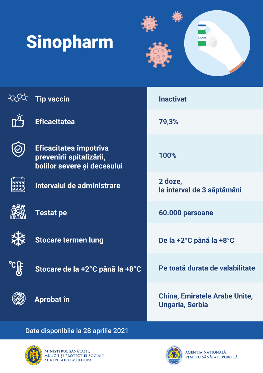 Sinopharm e un vaccin inactivat, produs de Beijing Bio-Institute of Biological Products Co Ltd, filială a China National Biotec Group (CNBG). Se administrează în două doze, la un interval de trei săptămâni, pentru persoanele cu vârsta de cel puțin 18 ani. Potrivit studiilor clinice, a fost raportată o eficacitate de 79,3%. Vaccinul e aprobat în 20 de țări și, recent, OMS l-a introdus în Lista de utilizare în urgențe (EUL), aprobând utilizarea acestuia la nivel mondial.