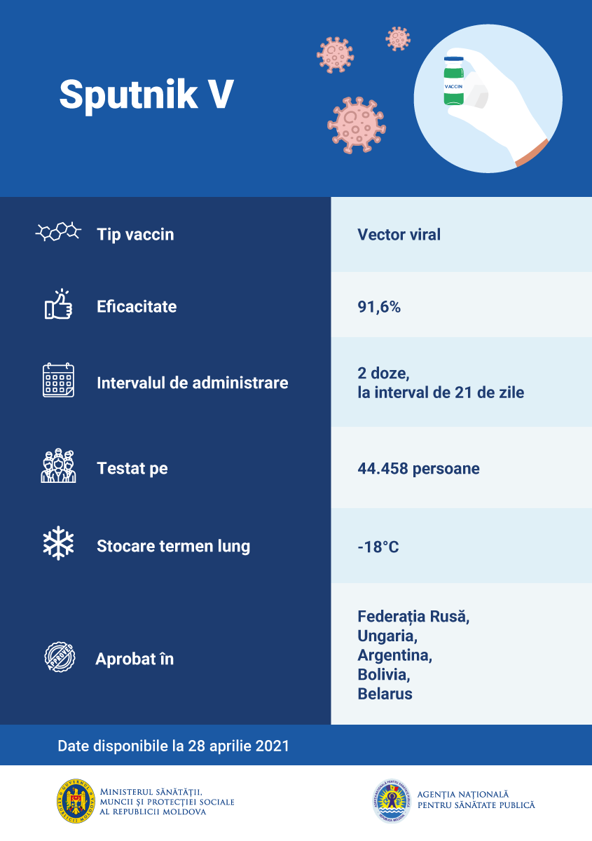 Sputnik-V e un vaccin produs la Moscova și se administrează în două doze, la un interval de 28 de zile, persoanelor cu o vârstă mai mare de 18 ani. Vaccinul e sigur și eficient, aprobat în 62 de țări, inclusiv în R. Moldova. S-a demonstrat o eficiență de 91,6% împotriva COVID-19 și o eficiență de 100% împotriva formelor severe de COVID-19.