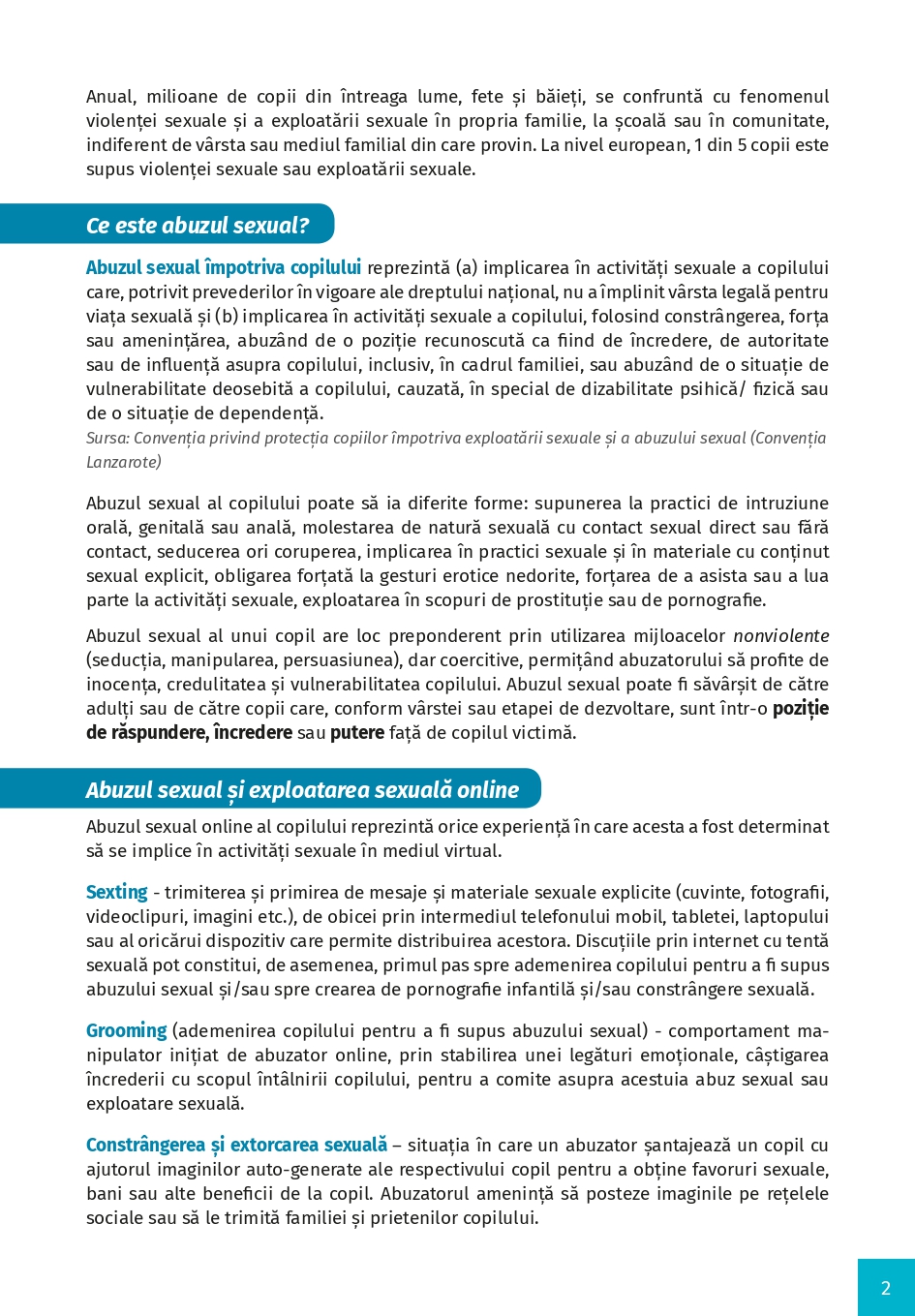 Fișa informativă și de sensibilizare a profesioniștilor din domeniul protecției copilului reprezintă o analiză și o sinteză a celor mai importante date și studii, cu scopul de a atrage atenția specialiștilor asupra numărului mare de copii victime ale abuzului sexual, dar și asupra extinderii fenomenului în mediul online, făcând apel la acțiuni de prevenire și intervenție în cazurile suspecte de abuz.