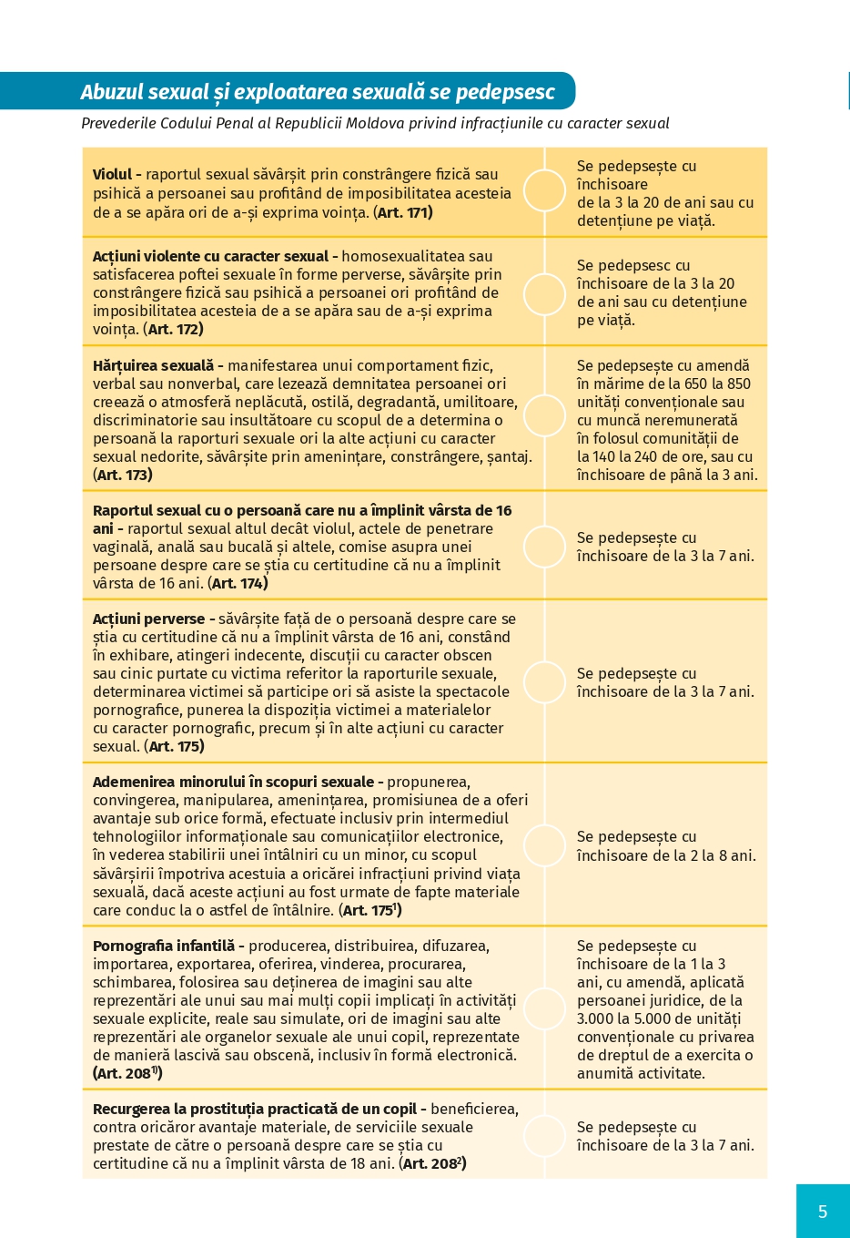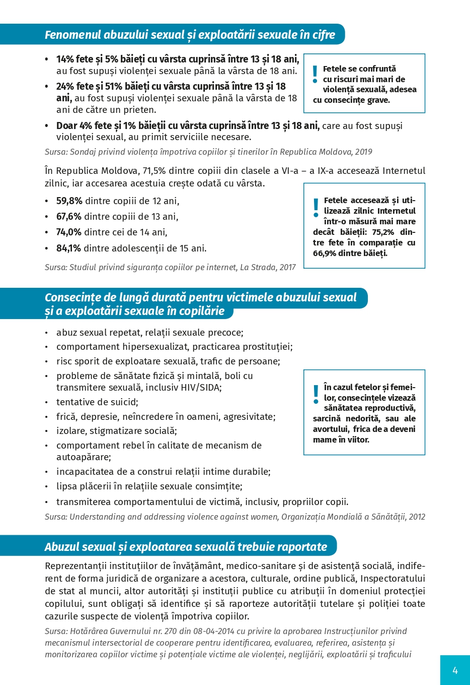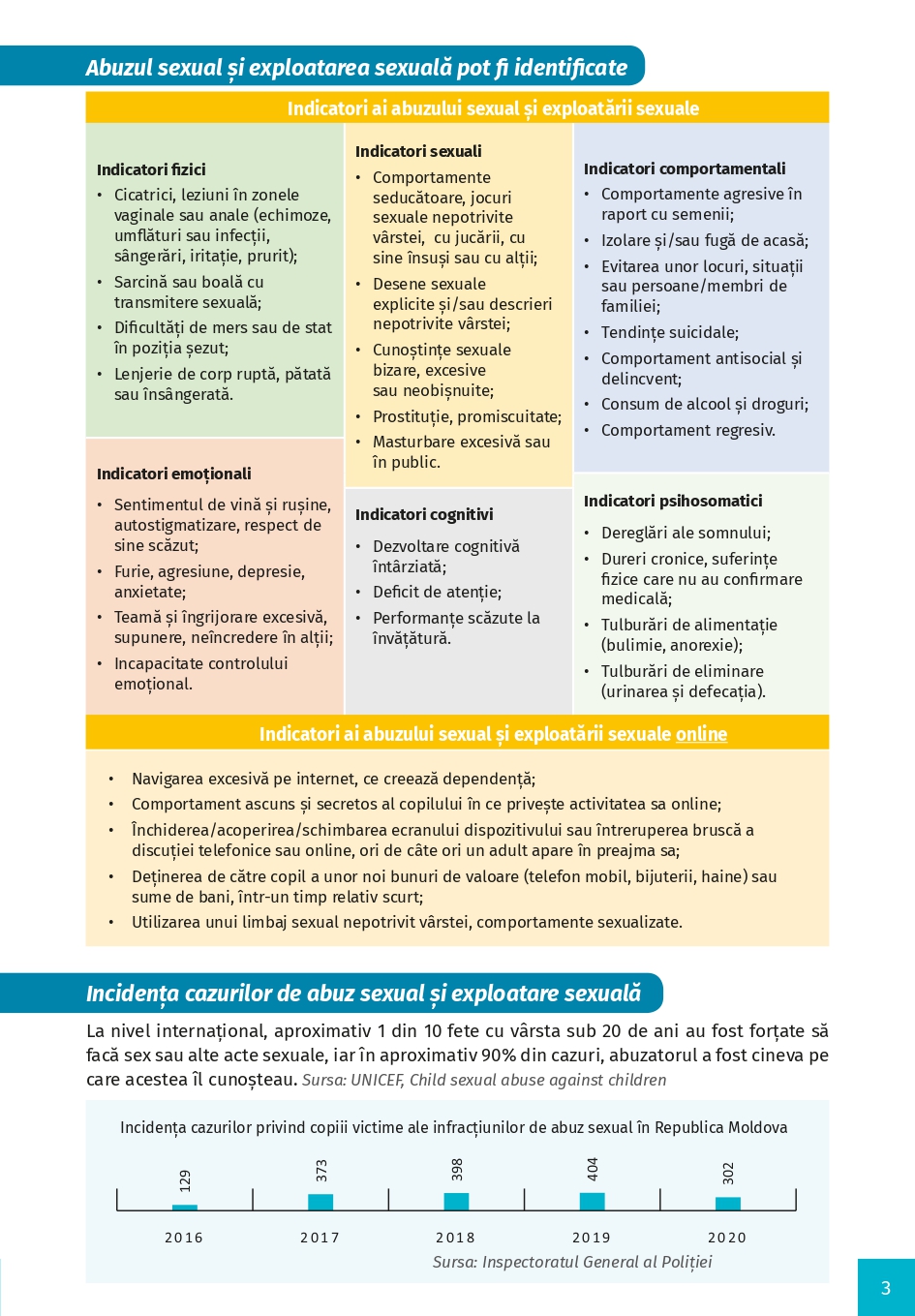 “Dacă în viața reală copilul este învățat de mic să nu vorbească cu persoane străine, atunci ce ține de comportamentul online al copilului, părintele sau profesioniștii mai puțin conștientizează riscurile și, prin urmare, nici sfaturi de siguranță online nu oferă. Zilnic, 1 din 5 copii primesc mesaje cu tentă sexuală în timp ce navighează pe internet. Și pentru că abuzul nu poate fi justificat, însă poate fi prevenit, încurajez publicul larg să facă uz de fișa informativă și să înțeleagă că abuzul sexual se poate întâmpla oricărui copil, atât băieților, cât și fetelor, în familie, la școală sau în comunitate”, menționează Natalia Țurcanu, coordonatoarea Programului de prevenire al Centrului Național de Prevenire a Abuzului față de Copii.