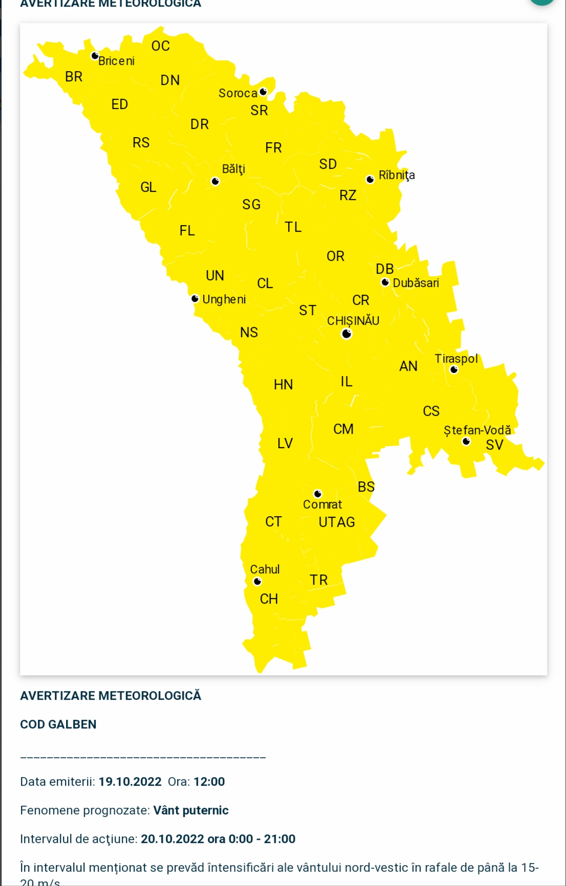Meteorologii au emis astăzi cod galben de vânt puternic pe întreg teritoriul țării. Conform Serviciului Meteorologic de Stat, se prevăd intensificări ale vântului, iar avertizarea va fi valabilă pe parcursul zilei de joi, 20 octombrie.