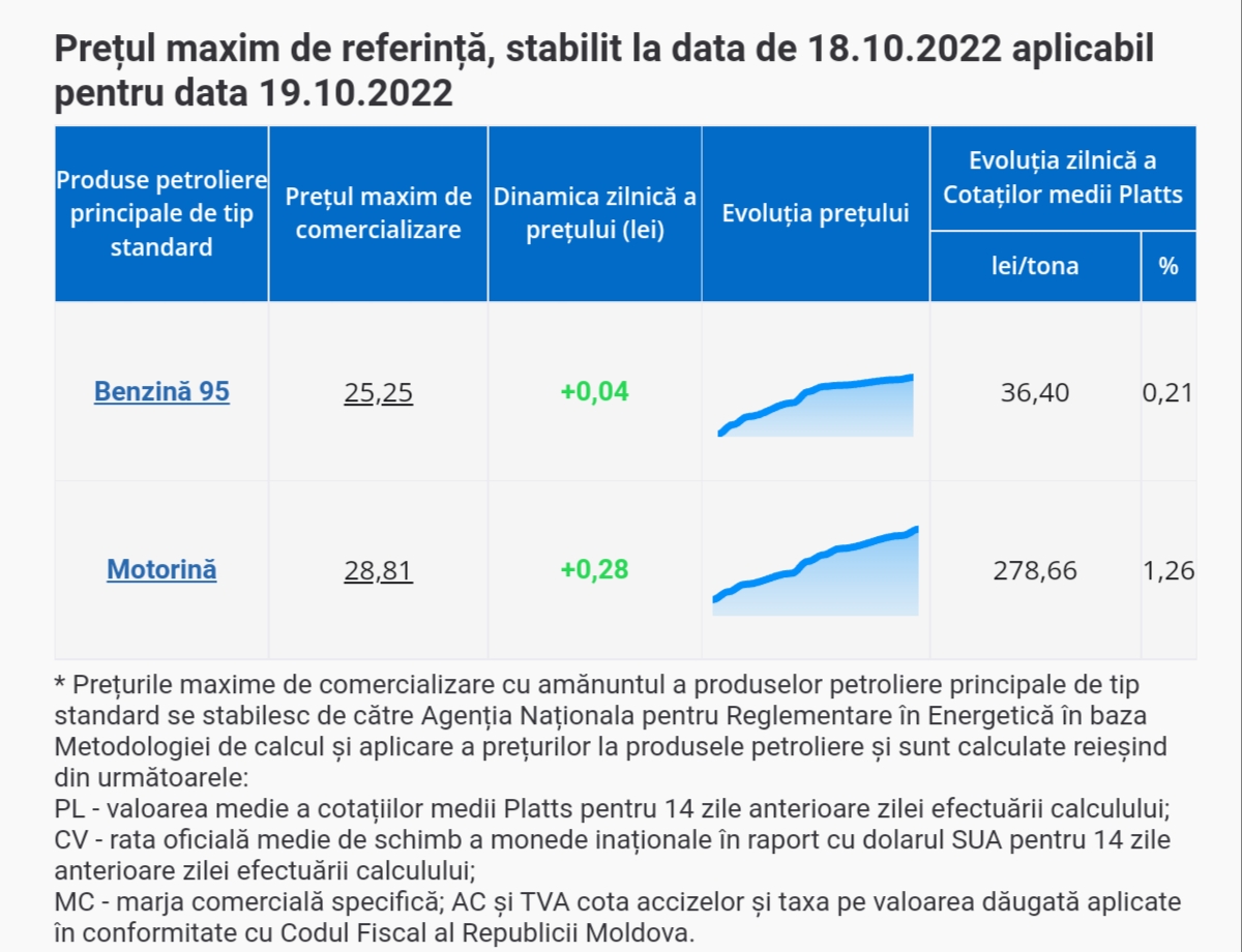 Pentru ziua de mâine, 19.10.2022, prețurile maximale de comercializare cu amănuntul a produselor petroliere principale de tip standard sunt stabilite la nivelul de: