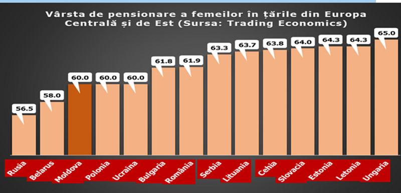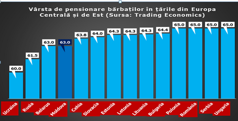 Bărbații, de exemplu, ies mai devreme la pensie, decât în Republica Moldova, doar în două țări: în Ucraina, la 60 de ani și Rusia, la 61 de ani și 6 luni. La polul opus se află Polonia, România, Serbia și Ungaria unde bărbații se pensionează la 65 de ani.