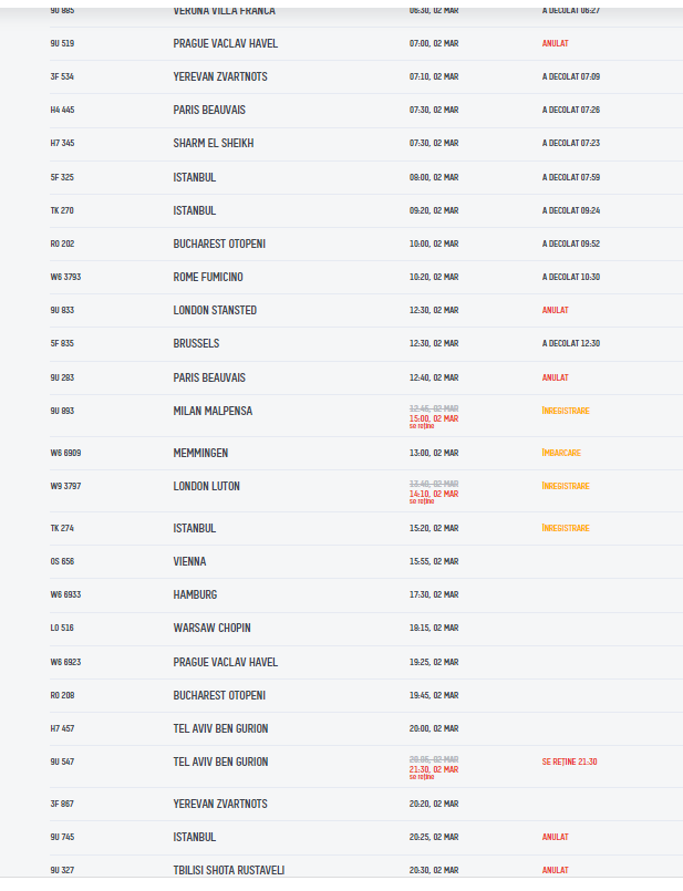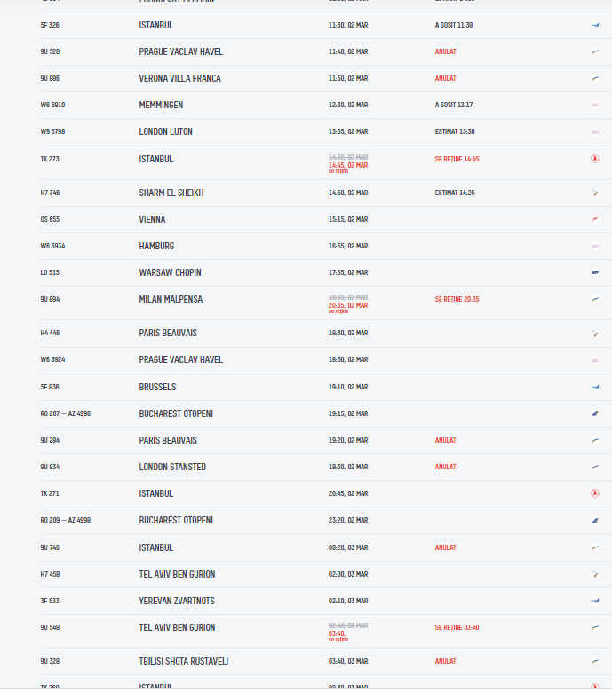 Pentru seară, nu vor fi ridicate de la sol avioanele care urmau să zboare spre Istanbul și Tbilisi. Zborurile spre Milano și Tel Aviv vor fi operate cu întârziere.