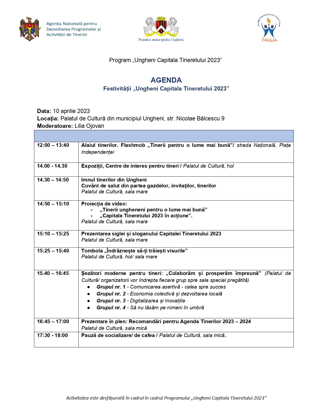 Reamintim că municipiul Ungheni a fost declarat Capitala Tineretului 2023 de către Ministerul Educației la finele anului 2022, Ungheniul fiind și prima Capitală a Tineretului în Republica Moldova – în anul 2011.