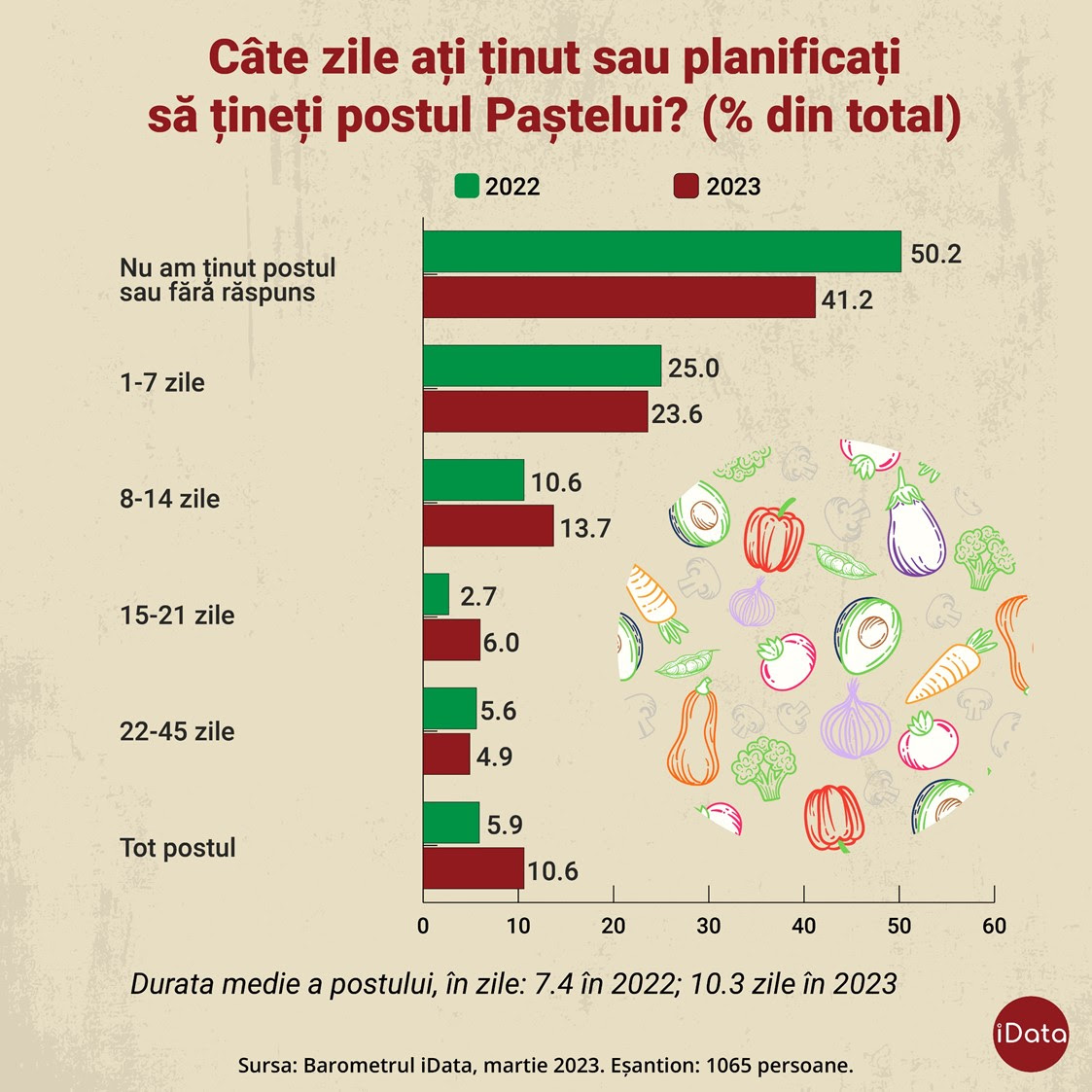 Într-o notă optimistă, 58,7% dintre adulți au declarat că vor respecta Postul Paștelui cel puțin o zi, în creștere cu aproape 9 puncte procentuale față de anul trecut. Se observă o diferență între mediul rural, unde 67,5% din populație vor ține postul, și cel urban, cu o rată de 47,1%. Mai multe femei (63,9%) decât bărbați (52,8%) au menționat că vor respecta postul cel puțin o zi. Durata medie a postului a crescut de asemenea, de la 7,4 zile în 2022 la 10,3 zile în 2023, iar numărul celor care intenționează să postească în totalitate aproape s-a dublat, de la 5,9% la 10,6%. De asemenea, ponderea celor care postează între 8-14 zile și 15-21 zile a crescut semnificativ, de la 10,6% la 13,7%, respectiv de la 2,7% la 6%. La nivel regional (cele 20 de regiuni statistice iData reprezintă un teritoriu continuu unde locuiesc câte circa 130 mii locuitori), regiunile Fălești și Florești înregistrează cel mai mare procent de persoane care țin postul, depășind 80%. În schimb, în orașele mari și în regiunea Cahul, mai puțin de jumătate din populație respectă această tradiție.