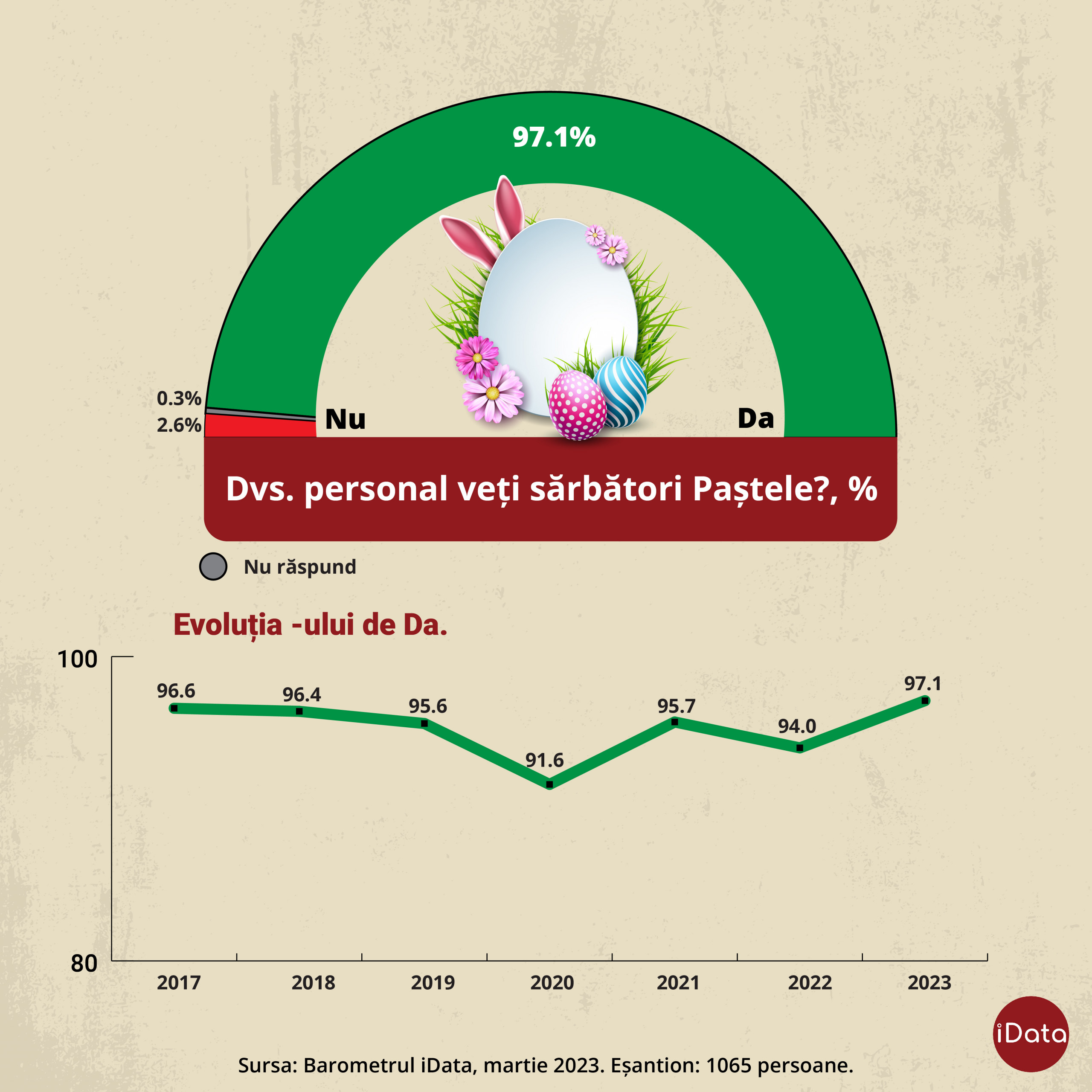 Un număr record de cetățeni ai Republicii Moldova, adică 97,1% din populație, se pregătesc să sărbătorească Paștele în acest an. Aceasta reprezintă cea mai mare proporție înregistrată de la începutul monitorizării de către iData acestui indicator în 2017, depășind recordul negativ din 2020, când doar 91,6% din populație au sărbătorit Paștele, în contextul pandemiei de COVID-19, transmite Barometrul iData.