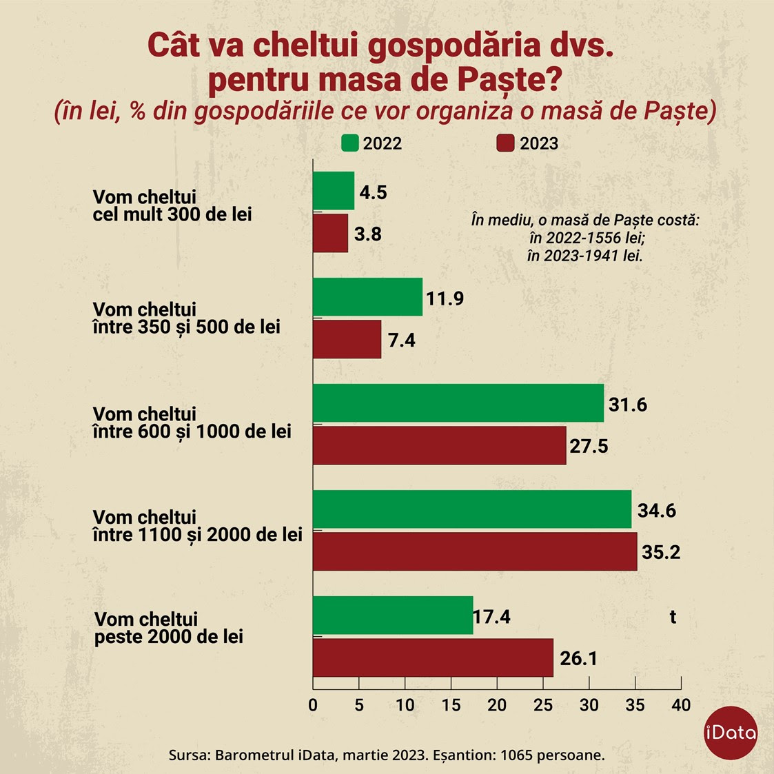 În ceea ce privește costurile mesei de Paști, o gospodărie și-a planificat să cheltuie, în medie, 1941 de lei în 2023, în creștere cu aproximativ un sfert față de 2022 (1556 lei). Această creștere este comparabilă cu nivelul inflației pentru această perioadă, ceea ce înseamnă că, deși costurile mesei de Paști vor fi mai mari, totuși cantitatea de produse pe masă va fi aproximativ aceeași ca anul trecut.