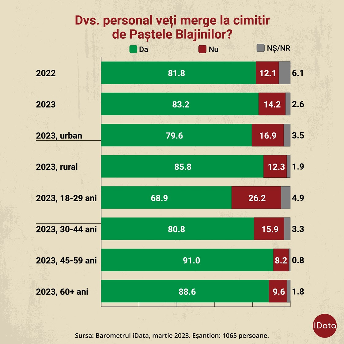 Paștele Blajinilor, sărbătorit la o săptămână după Paște, va atrage aproximativ 83,2% din populația țării, care intenționează să meargă la cimitir. Doar 14,2% dintre adulți au spus că nu vor merge, iar 2,6% nu au răspuns. În special, se va merge la cimitire în mediul rural (85,8%) și ceva mai puțin în orașe (79,6%). Tinerii cu vârste între 18-29 de ani (68,9%) vor veni într-o măsură mai mică spre cimitire, comparativ cu grupul de vârstă 45-59 ani (91%) sau cel de 60 ani și peste (88,6%). La nivel regional, interesul pentru a merge la cimitire de Paștele Blajinilor este mai mic în Chișinău și Bălți, în regiunea Anenii Noi și Cahul, și ceva mai crescut în regiunile de Nord, în special în regiunea Fălești.