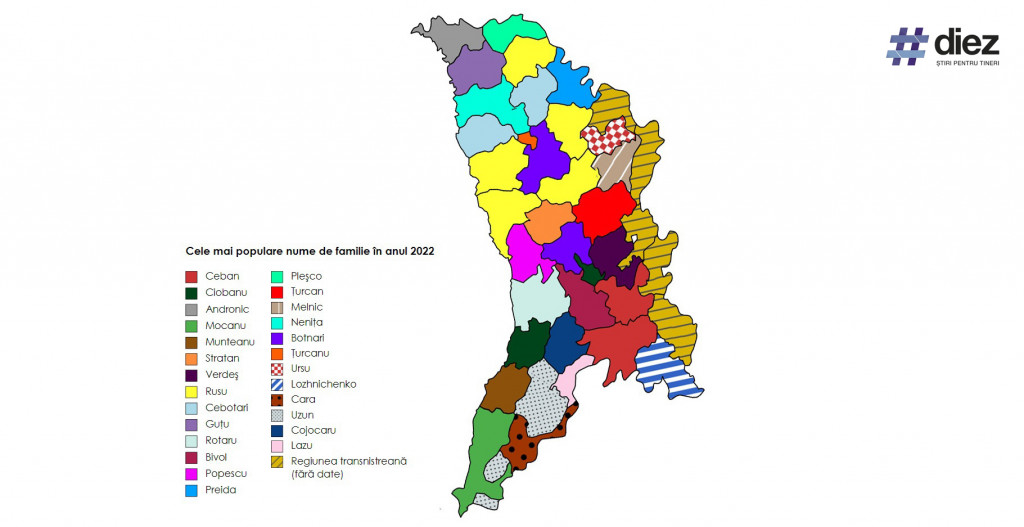 Topul celor mai populare nume de familie a fost întocmit de echipa #diez. Aceștia au prezentat și o hartă a Moldovei a numelor în funcție de localitate pe parcursul anului 2022.