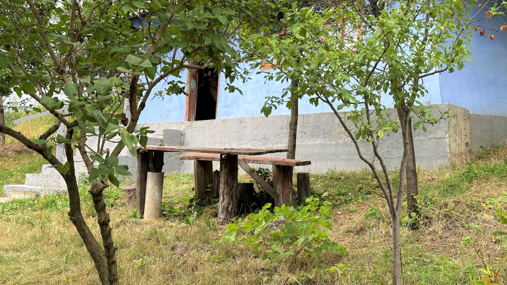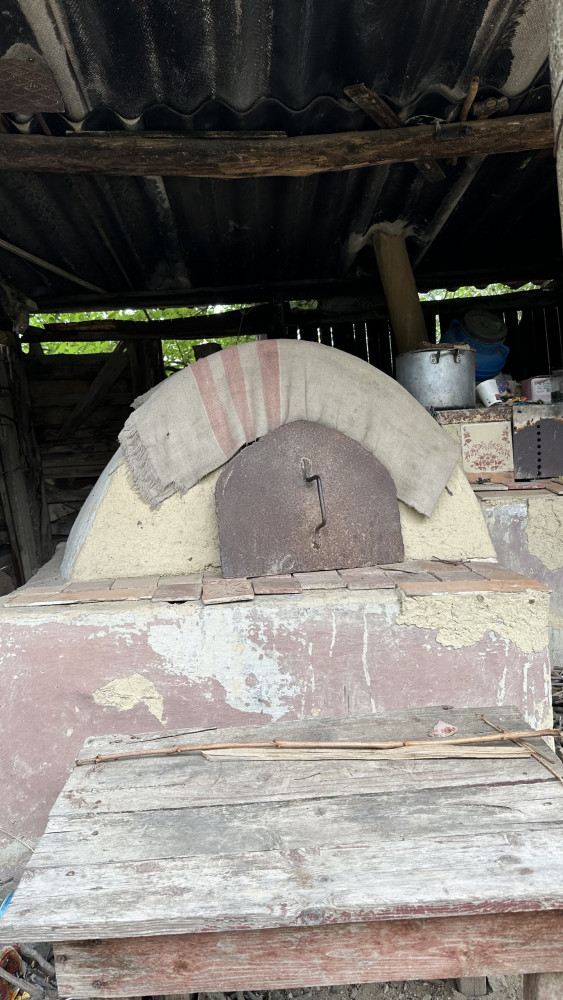 Am încercat să facem gălăgie la poartă, poate-poate ne-a auzi cineva și a ieși afară. Straja curții, un cuțulache cu blănița neagră, a început să latre, anunțându-și stăpânii că sunt vizitatori la poartă. În prag, a ieșit o femeie trecută de 70 de ani, într-o rochie înflorată, iar pe cap purta o basma. Ne-a invitat să intrăm în curtea casei. Aproape de colțul casei, la un metru distanță, e înjghebată o masă și un scaun de lemn, iar alături sunt și două buturuge. Nu departe, e o construcție auxiliară, în care se „odihnește” un cuptor, în care gospodina casei, pe vremuri, cocea pâinea, plăcintele sau alte bunătăți.