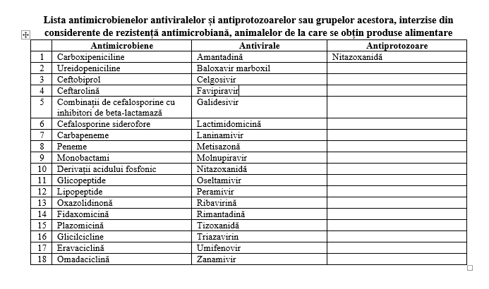 În urma analizei efectuate, mai multe antibiotice, mai multe antivirale și un antiprotozoal au nimerit în lista produselor interzise, din considerente de rezistență antimicrobiană, animalelor de la care se obțin produse alimentare.