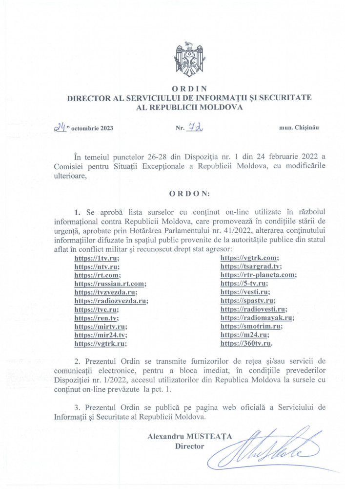 Serviciul de Informații și Securitate (SIS) anunță că, prin ordinul directorului SIS din 24 octombrie, a fost completată lista surselor cu conținut online „care alterează, în condiţiile stării de urgenţă, aprobate prin Hotărârea Parlamentului nr. 41/2022, conţinutul informaţiilor difuzate în spaţiul public, provenite de la autorităţile publice din statul aflat în conflict militar şi recunoscut drept stat agresor”.