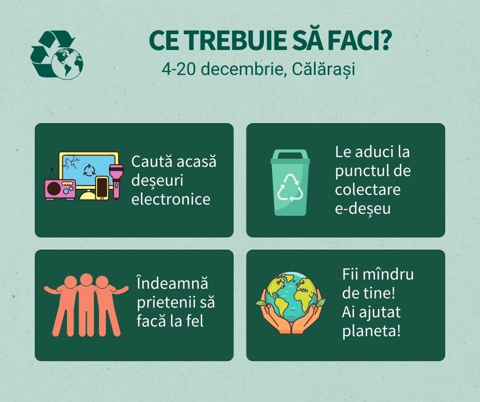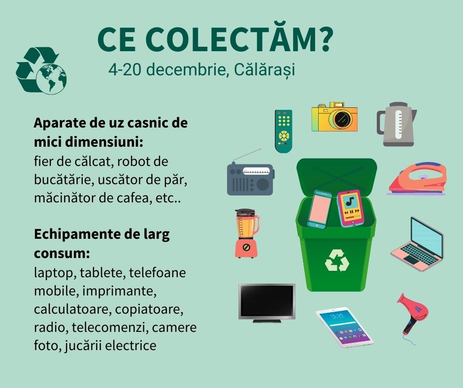 Autoritățile publice locale din orașul Călărași au inițiat ”Campania de Colectare a Deșeurilor Electronice”. Astfel, în perioada 4-20 decembrie, toți călărășenii sunt îndemnați să colecteze toate tipurile de deșeuri electronice care sunt defecte și nu mai pot fi utilizate, începând de la telefoane, fiare de călcat, uscătoare de păr, calculatoare, tablete, jucării electrice, radiouri, telecomenzi, copiatoare sau chiar frigidere.
