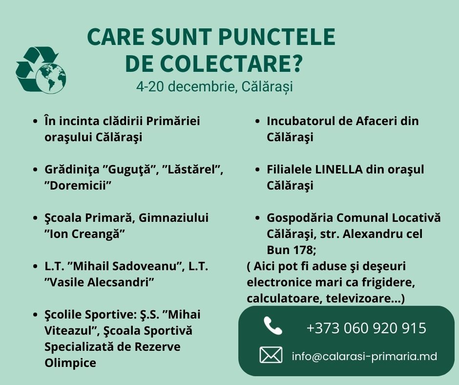 ”Fiecare dintre noi are oportunitatea să contribuie la crearea unui mediu sănătos de viață și să ofere șansa generațiilor viitoare la o planetă sănătoasă și prietenoasă, deoarece deșeurile electronice poluează grav mediul, iar noi ne putem implica să evităm acest dezastru”, scriu reprezentanții primăriei Călărași, pe rețelele sociale.