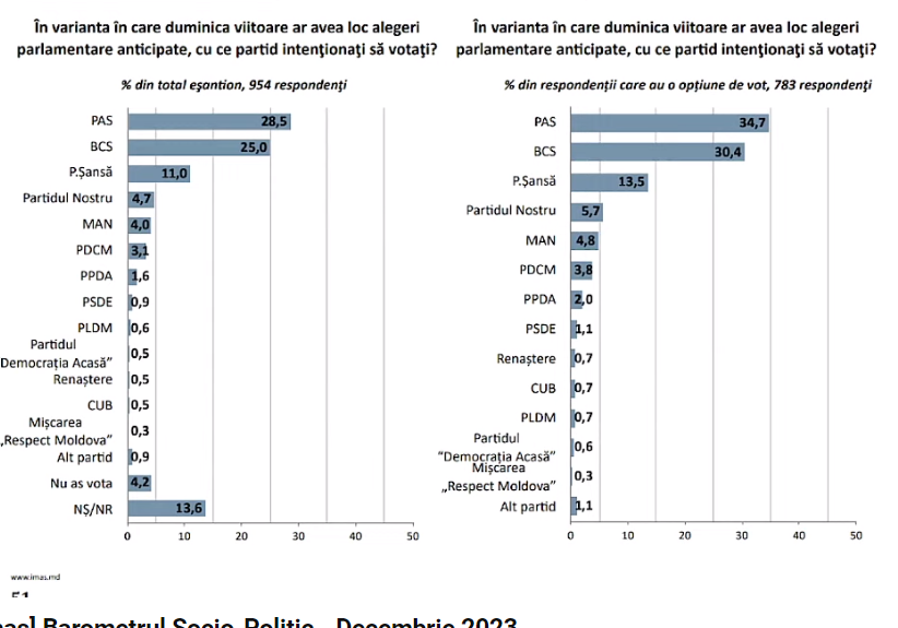 Astfel, cele mai multe voturi le-ar acumula PAS – 34,7%, BCS ar acumula 30,4%, P Șansă – 13,5% iar Partidul Nostru ar fi la limită cu 5,7%. Restul formațiunilor politice nu ar trece pragul electoral.