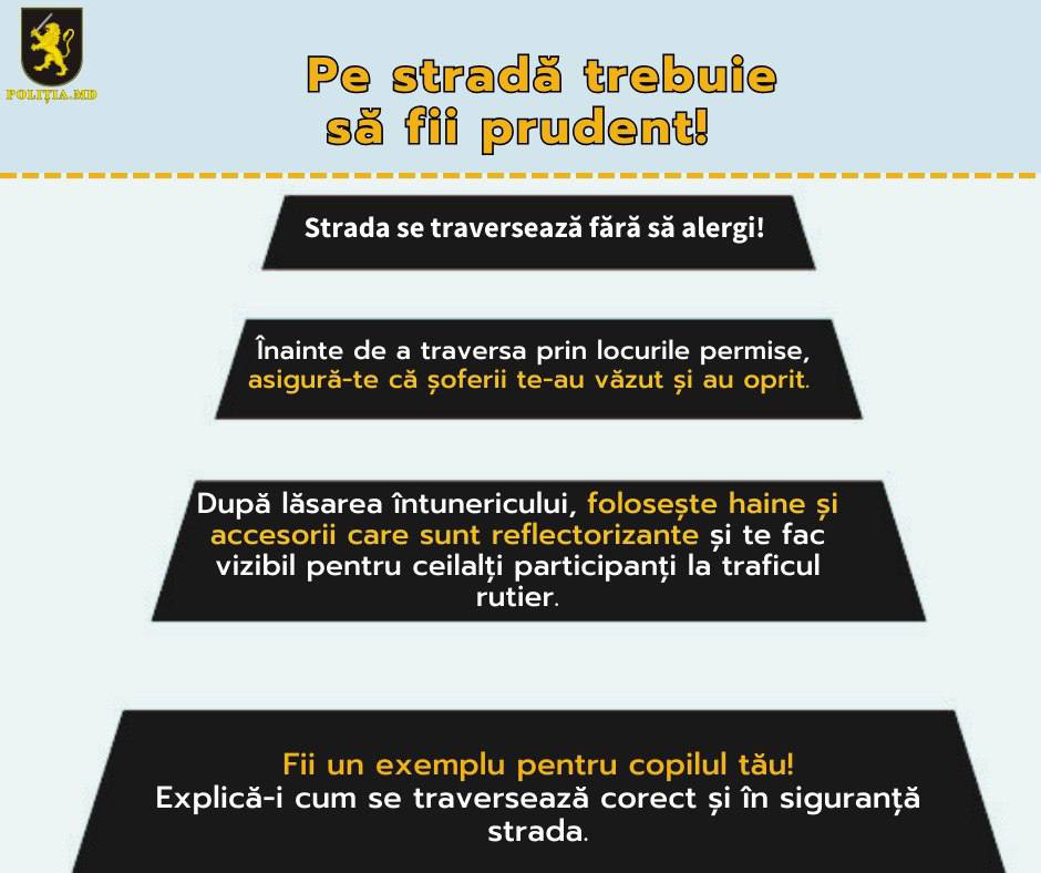 Totodată, pietonii care ignoră semnele de dirijare a traficului rutier, traversează neregulamentar partea carosabilă sau se deplasează în locuri interzise sunt amendați cu până la 450 de lei.