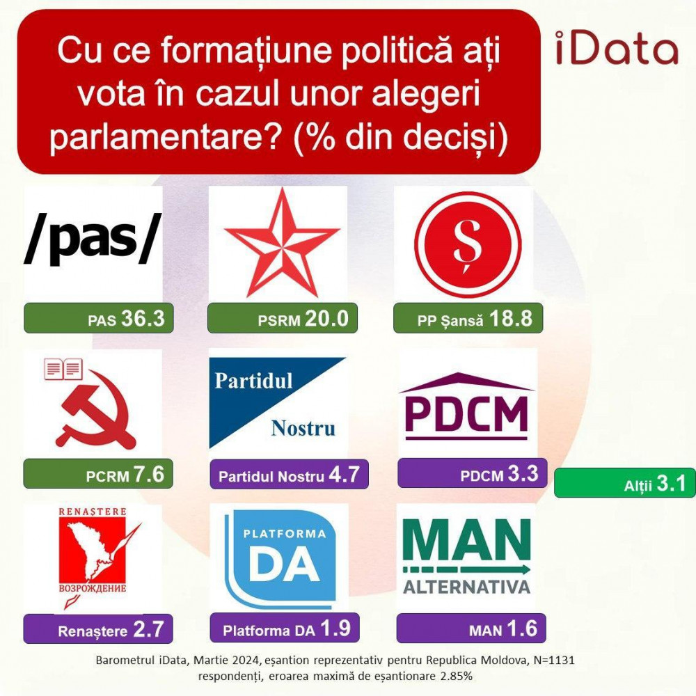 Patru partide politice ar accede în viitorul Parlament, în cazul alegerilor anticipate. Datele se regăsesc într-un sondaj prezentat de compania iData. Potrivit datelor prezentate, PAS ar acumula 36,3% din numărul respondenților deciși, în timp ce PSRM ar lua 20%. „Șansa” lui Șor este susținută de 18,8%, iar PCRM – de 7,6%, scrie deschide.md.