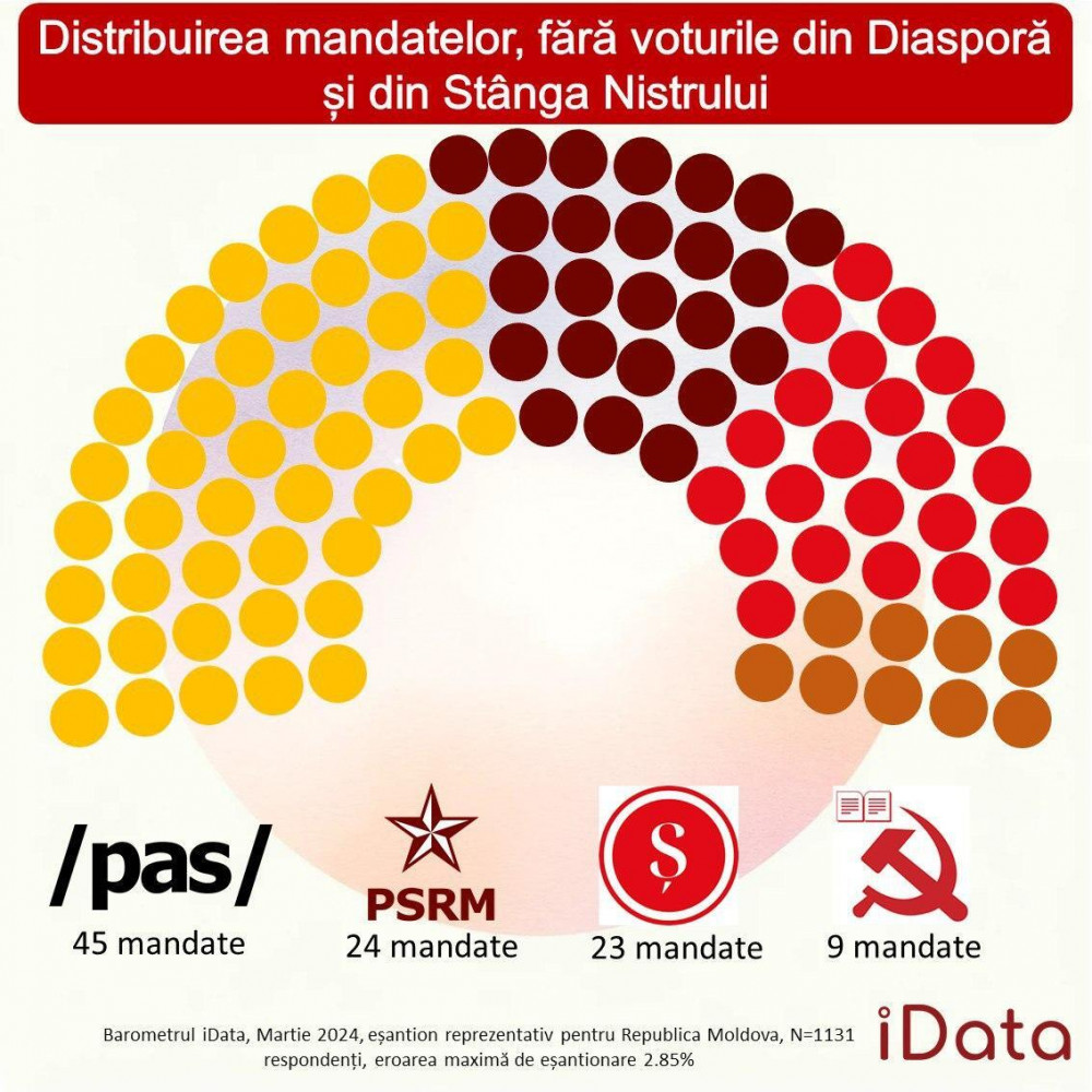 Alte formațiuni nu ar trece de pragul de reprezentare de 5%. La distribuirea mandatelor, PAS ar obține 45 mandate, PSRM – 24 mandate, „Șansa” – 23 mandate, iar PCRM – 9 mandate.