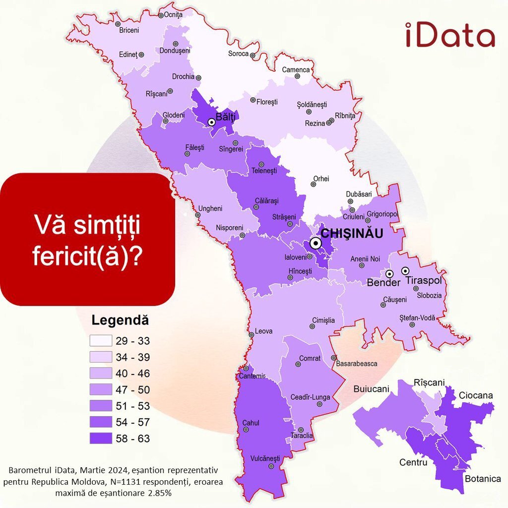 Cei mai fericiți oameni se găsesc la Bălți și Chișinău. Faptul că locuiesc în oraș poate fi cauza fericirii moldovenilor, explică autorii sondajului. În capitală, cei mai fericiți se consideră cei din sectoarele Centru, Botanica și Ciocana. Iar cei care au răspuns că se simt nefericiți se află în sectorul Buiucani.
