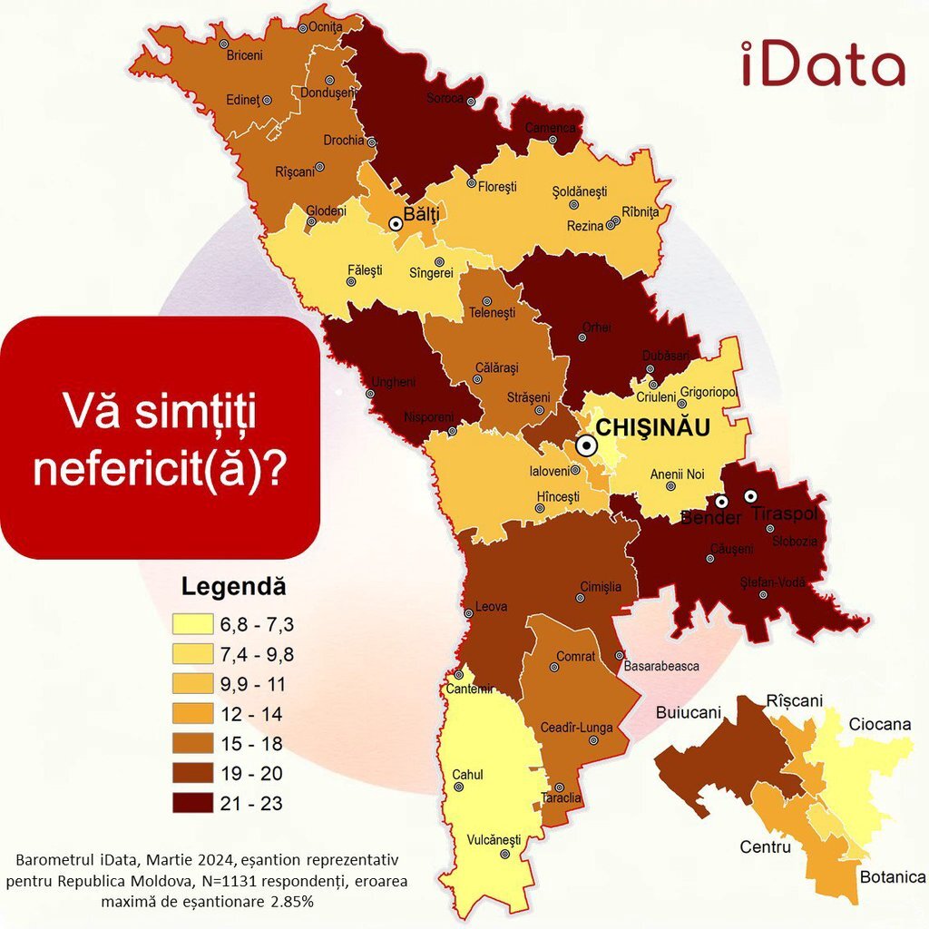 La polul opus se află cei care sunt „deloc fericiți”, aceștia constituie 5,5% din numărul total de respondenți. Sunt și moldoveni care se consideră nefericiți, raionul Ungheni se află pe locul III, fiind depășit de raionul Soroca pe locul I, Orhei pe locul II și urmat de Tiraspol pe locul IV. În aceste zone ale țării mai mulți moldoveni se consideră nefericiți.