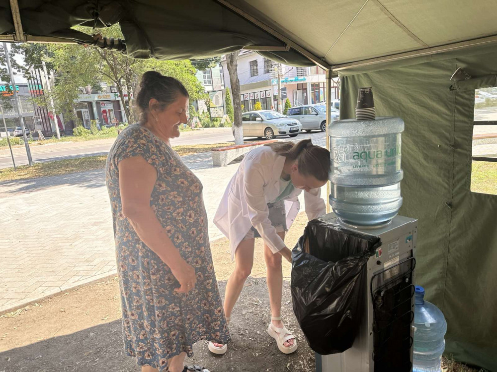 Între timp, pentru a bea un pahar cu apă s-a apropiat o femeie trecută de 50 de ani. „Astăzi am fost nevoită să ies din casă, deoarece am niște lucruri de rezolvat. Am văzut cortul și m-am apropiat să beau un pic de apă. Chiar e binevenit, mai ales pe căldura aceasta, faci un popas, te mai răcorești și parcă îți mai dă putere. De regulă, încerc să stau mai mult pe la umbră, atunci când sunt temperaturile mari, dar pot spune că eu sunt deja obișnuită, lucrez la piață și pe timp de iarnă, și pe timp de vară și sunt așa „mai călită””, spune doamna Veronica.