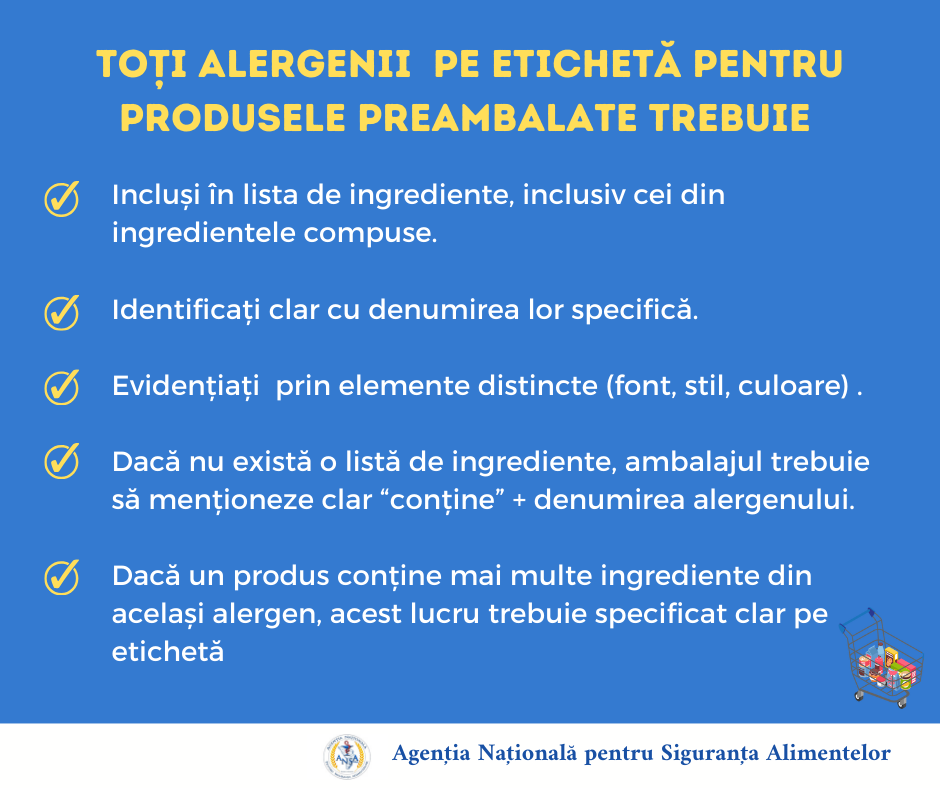 „În urma implementării programului de monitorizare, au fost prelevate mai multe probe (la produse din carne, produse culinare și produse de patiserie), în vederea determinării alergenilor nedeclarați. În rezultatul investigațiilor de laborator, s-au depistat mai multe produse neconforme cu prezența de gluten, arahide, soia, lapte sau ou – nedeclarate pe etichetă sau în meniu”, menționează Agenția Națională pentru Siguranța Alimentelor (ANSA).