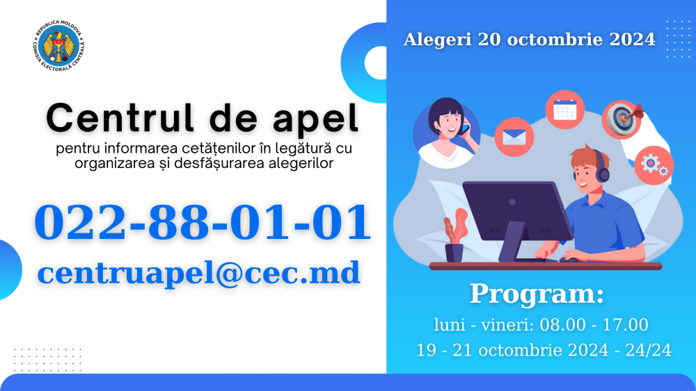 Linia de informare a Centrului de Apel va funcționa de luni până vineri, între orele 8.00 – 17.00, iar în perioada 19-21 octombrie și 2-4 noiembrie (în cazul turului II) programul de lucru va fi extins până la 24 de ore pe zi.