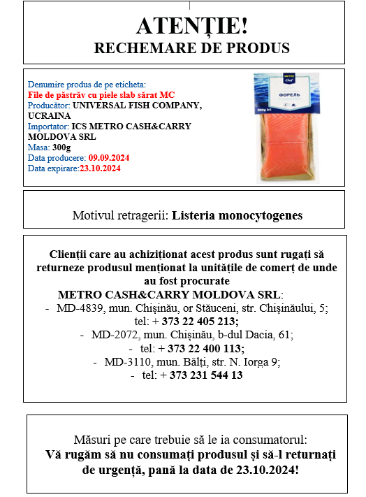Agenția Națională pentru Siguranța Alimentelor (ANSA) a anunțat astăzi că retrage din comerț un lot de păstrăv cu piele, slab sărat.