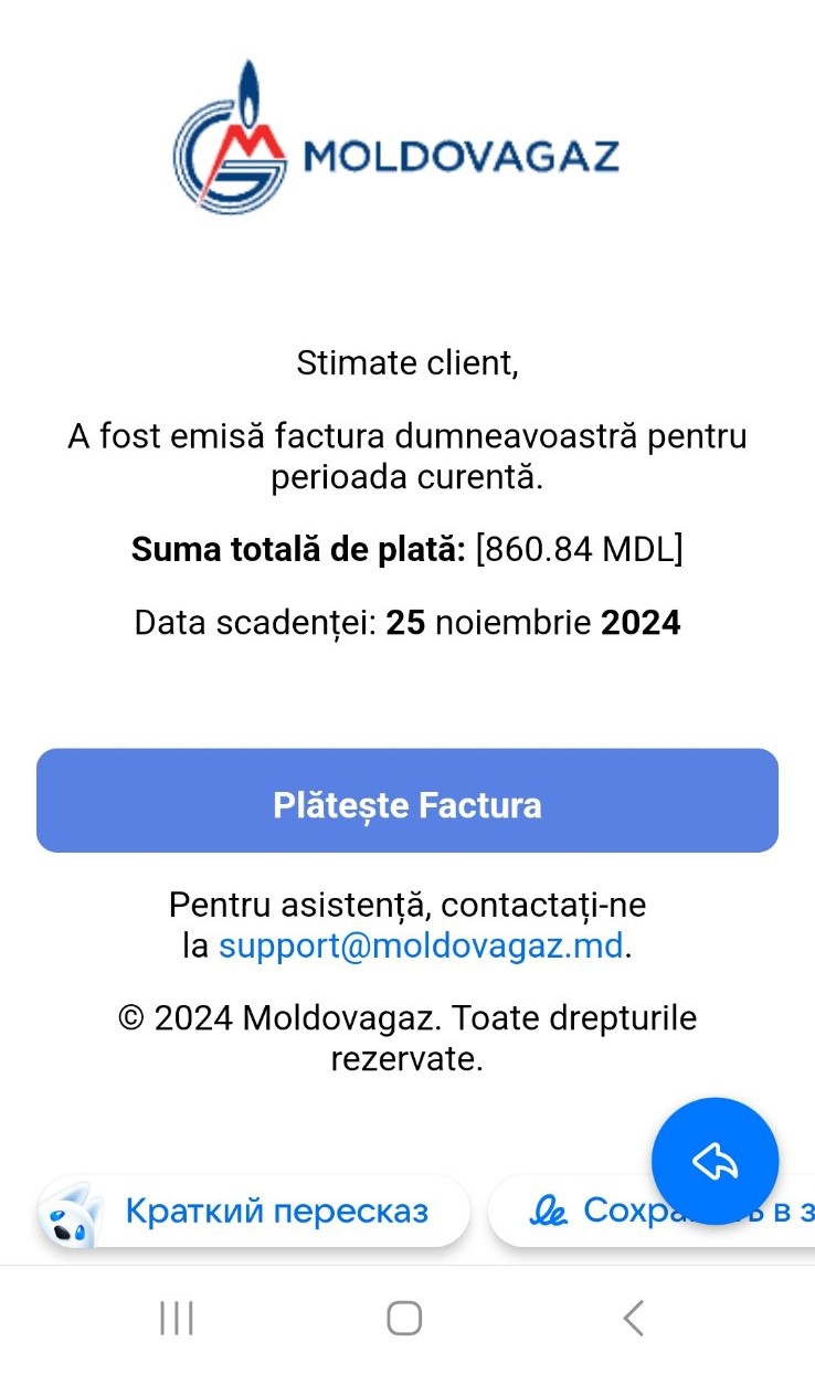 În ultimele zile, la adresele de e-mail ale mai multor consumatori ai SA „Moldovagaz” au parvenit scrisori electronice, pretins din numele întreprinderii, conținând informații false despre sume facturate, precum și un link de plată activ. Efectuând clic pe acest link, consumatorul este redirecționat la o adresă falsă în internet, unde i se cere să introducă datele sale bancare.
