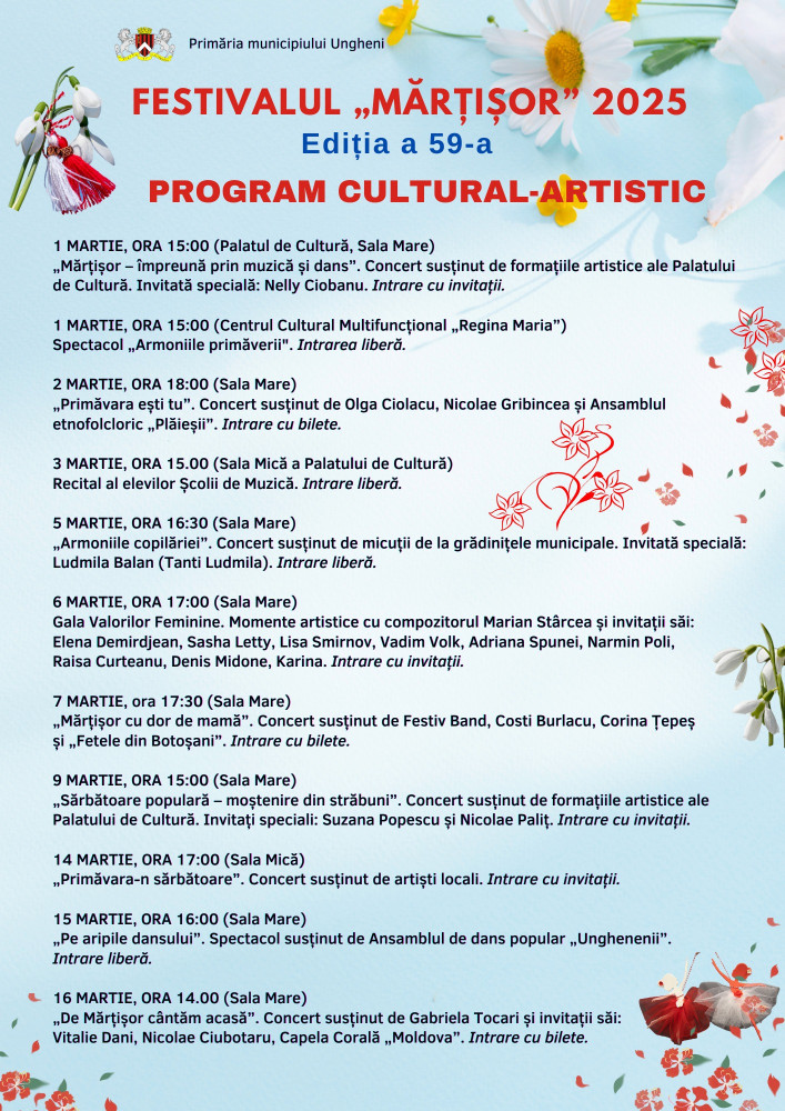 La fel pe 1 martie la ora 15:00, la Centrul Cultural Multifuncțional „Regina Maria” va avea loc spectacolul „Armoniile Primăverii”. Intrare liberă.