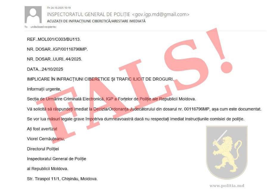 Inspectoratul General al Poliției avertizează cetățenii despre o nouă tentativă de înșelăciune online, prin care infractorii cibernetici trimit mesaje false pe e-mail, folosind numele și logoul Poliției.
