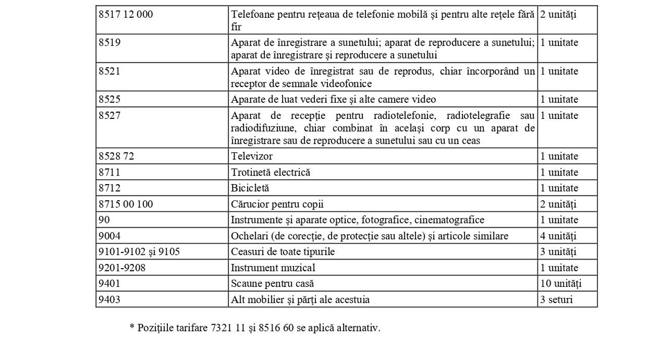 Proiectul prevede că persoanele revenite definitiv acasă vor putea introduce, fără plata drepturilor vamale: până la 100 de kilograme de haine purtate și zece perechi de încălțăminte; o bicicletă, două covoare și până la 20 de kilograme de lenjerie; câte o unitate de electrocasnice din fiecare categorie, inclusiv: un televizor, o mașină de cusut, o mașină de spălat vase, o mașină de spălat rufe, un cuptor cu microunde, o cafetieră; 10 scaune și trei seturi de alte piese de mobilier; accesorii personale, precum trei ceasuri și patru perechi de ochelari. Lista completă este prevăzută într-un proiect de hotărâre de Guvern, aflat pe agenda ședinței din 18 februarie a Cabinetului de miniștri.