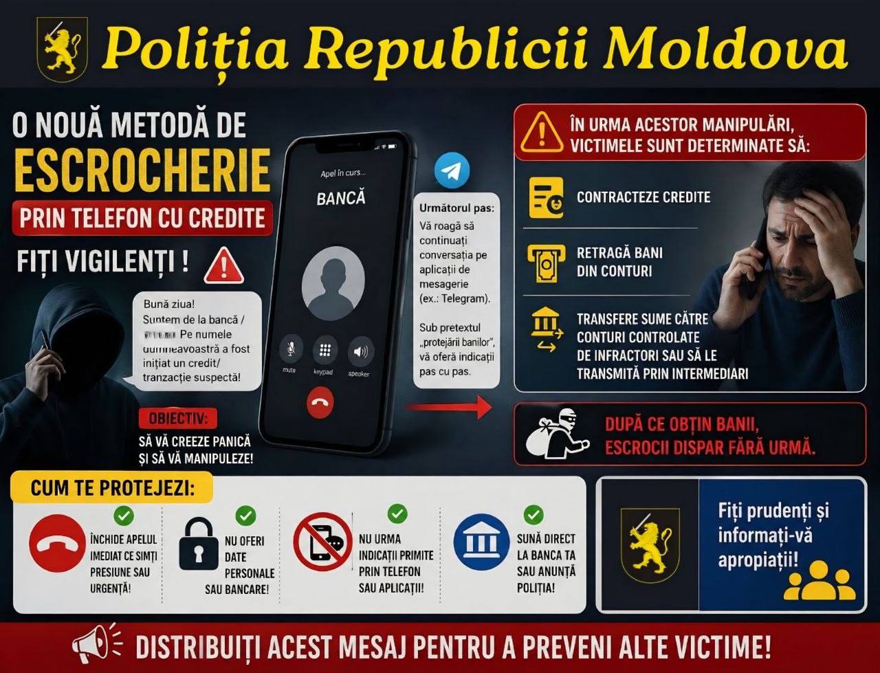 Poliția Republicii Moldova avertizează asupra apariției unei noi metode de fraudă, prin care escrocii încearcă să obțină bani de la cetățeni, pretinzând că sunt reprezentanți ai băncilor sau ai organelor de drept.